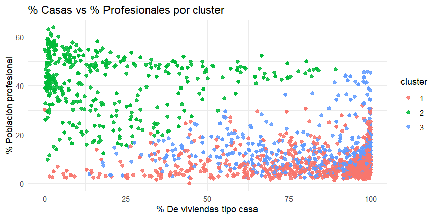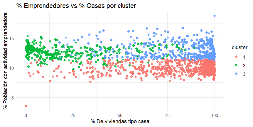 Además, se elaboraron gráficos de dispersión entre las variables (% emprendedores, % casas y % profesionales), coloreados por cluster, con el objetivo de interpretar las relaciones internas dentro de cada grupo y comprender la estructura de correlaciones entre variables socioeconómicas. Estos gráficos permiten identificar, por ejemplo, zonas donde el emprendimiento se vincula a contextos residenciales específicos, ya sea predominio de casas o de departamentos, y a sectores con menor presencia de población profesional o con menor diversidad habitacional.