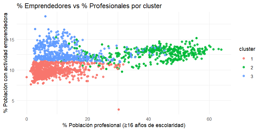 El análisis de clustering permitió identificar patrones territoriales complejos a partir de la relación conjunta entre tres variables socioespaciales: el porcentaje de población con actividad emprendedora, el porcentaje de viviendas tipo casa y el porcentaje de población profesional (personas con 16 o más años de escolaridad). A diferencia de otras, esta metodología busca agrupar zonas censales con comportamientos similares considerando simultáneamente múltiples dimensiones socioeconómicas.