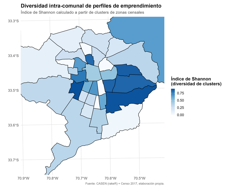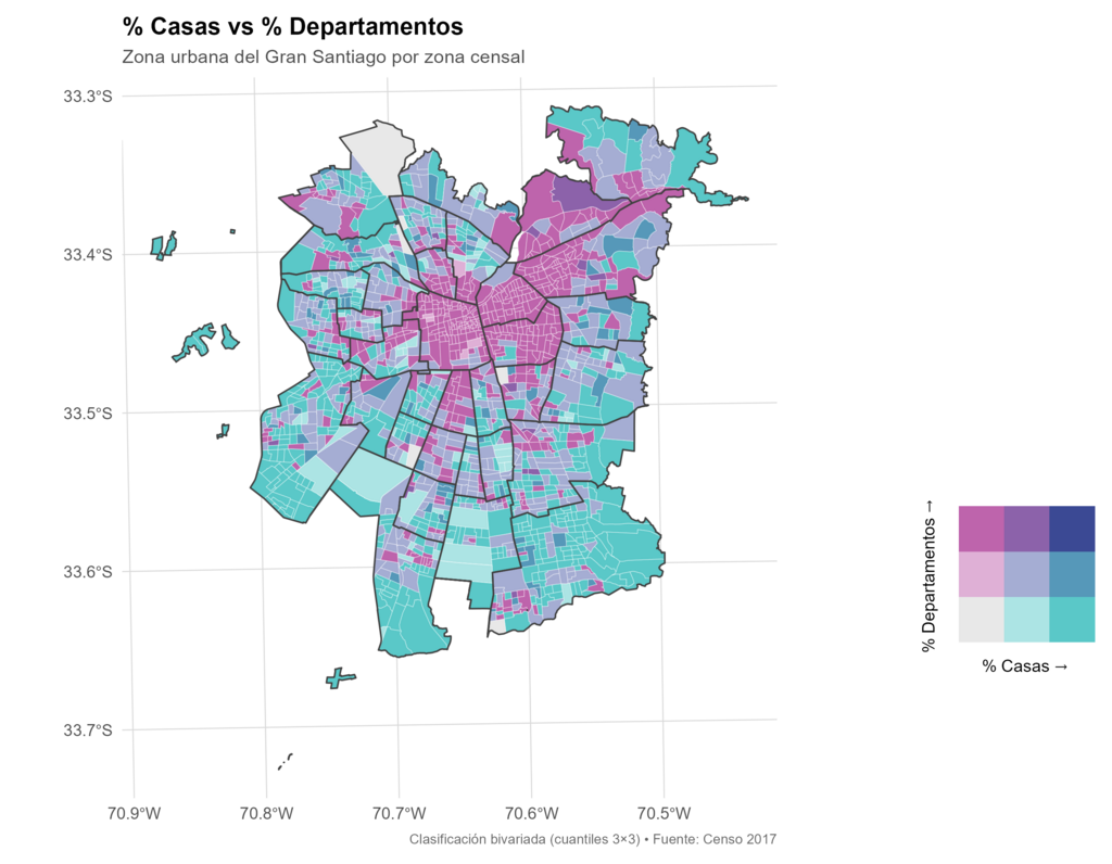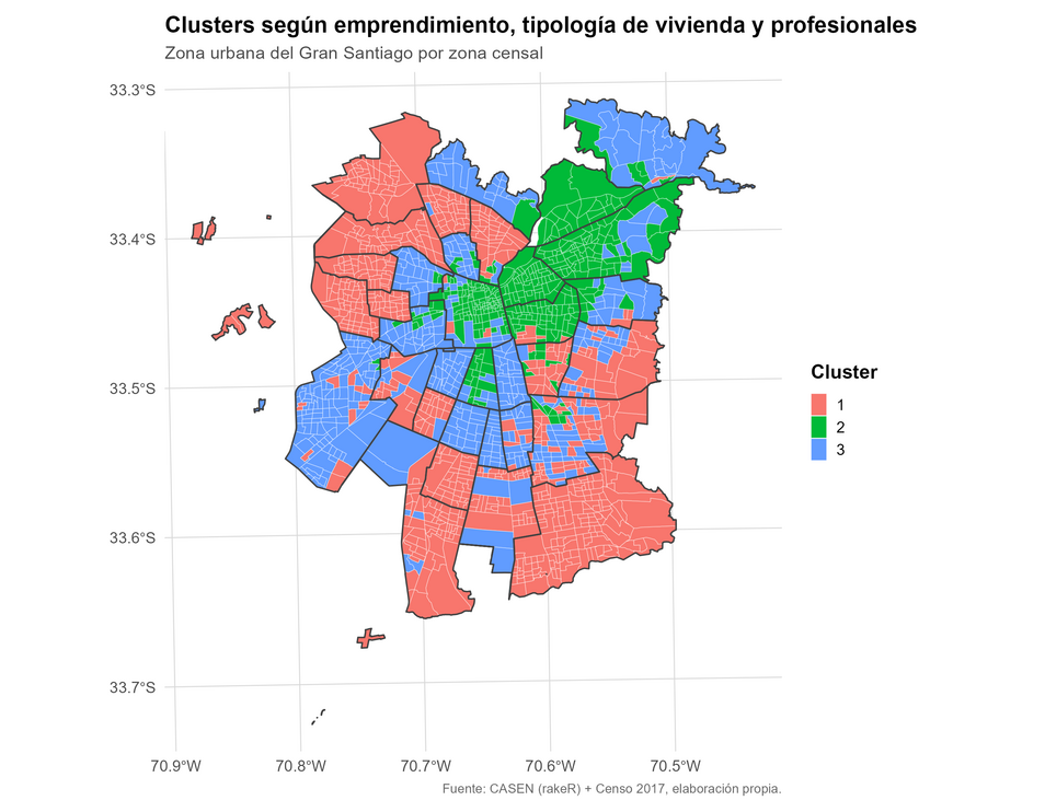 Finalmente, la representación cartográfica se realizó en R, sobre la delimitación oficial del área urbana del Gran Santiago, utilizando una simbología uniforme con bordes blancos entre zonas censales. Este enfoque multivariable permitió visualizar la estructura espacial de la relación entre emprendimiento, forma de habitar y nivel profesional, revelando configuraciones urbanas diferenciadas en el territorio metropolitano.