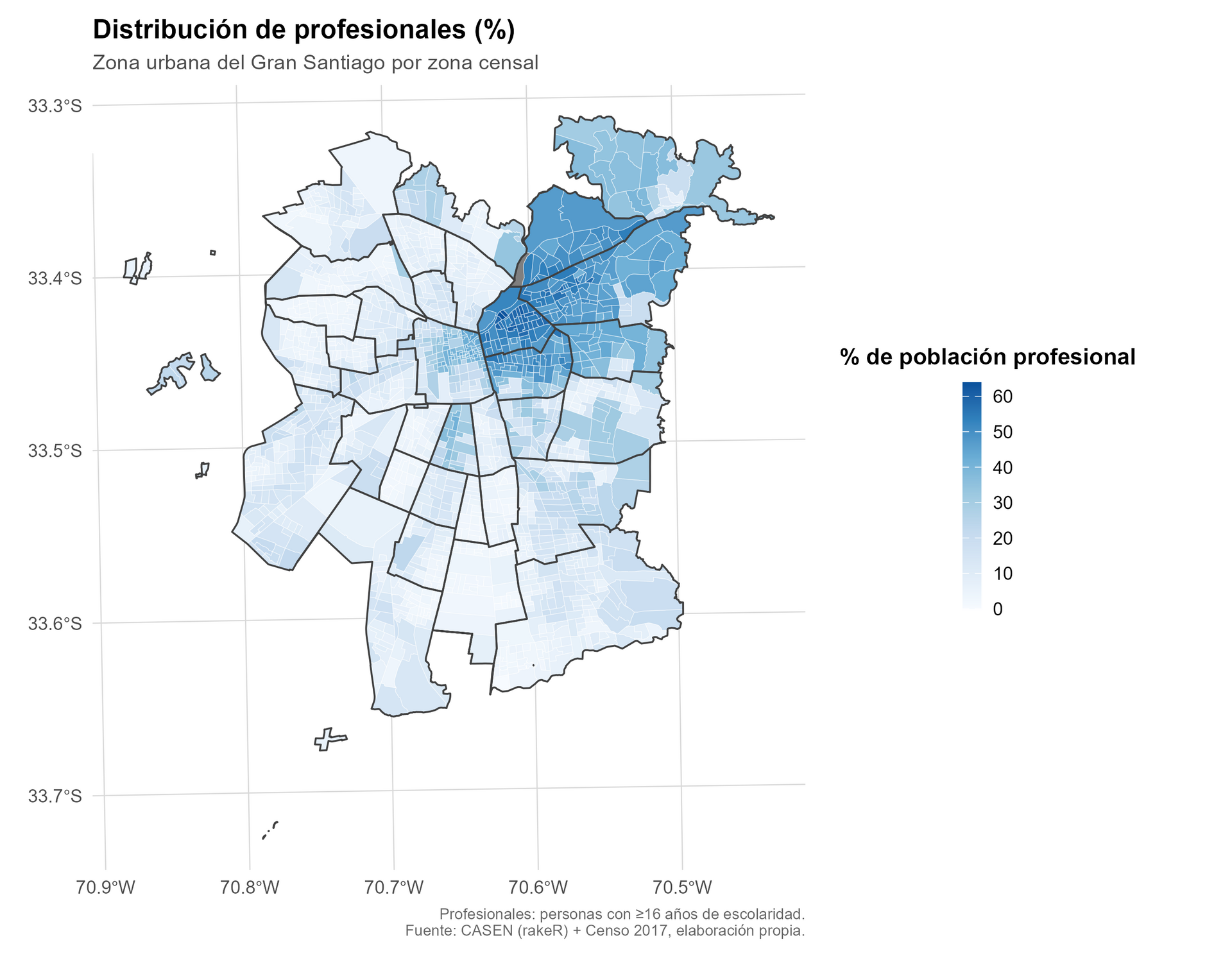 De manera complementaria, para el mapa de distribución de profesionales se empleó la misma base sintética obtenida mediante raking, identificando como “profesionales” a las personas con 16 o más años de escolaridad. A partir de esta definición, se estimó el porcentaje de población profesional por zona censal urbana del Gran Santiago, permitiendo visualizar la concentración espacial de los niveles educacionales superiores dentro de la estructura urbana metropolitana.