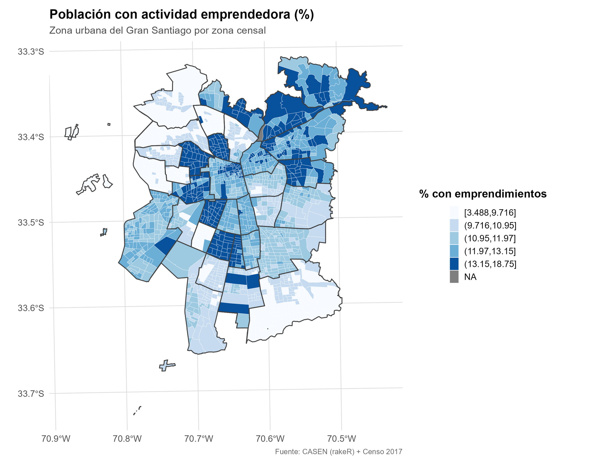 El porcentaje de personas con actividad emprendedora presenta una marcada heterogeneidad territorial dentro del Gran Santiago. Los valores más altos se concentran en el sector sur, especialmente en el entorno del conjunto habitacional La Platina (La Pintana), megaproyecto de viviendas sociales donde el emprendimiento alcanza un 18,8 % de la población. En este sector, la actividad emprendedora funciona como una estrategia de sustento y resiliencia local, asociada a contextos con menor acceso al empleo formal y una fuerte presencia de redes comunitarias que favorecen el autoempleo y la producción doméstica.